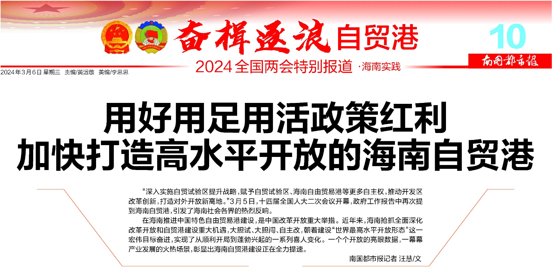 3月5日,十四屆全國(guó)人大二次會(huì)議開(kāi)幕,政府工作報(bào)告中再次提到海南自貿(mào)港,引發(fā)了海南社會(huì)各界的熱烈反響,新海南客戶端、南海網(wǎng)播發(fā)《報(bào)告熱詞·海南實(shí)踐 | 用好用足用活政策紅利 加快打造高水平開(kāi)放的海南自貿(mào)港》…
