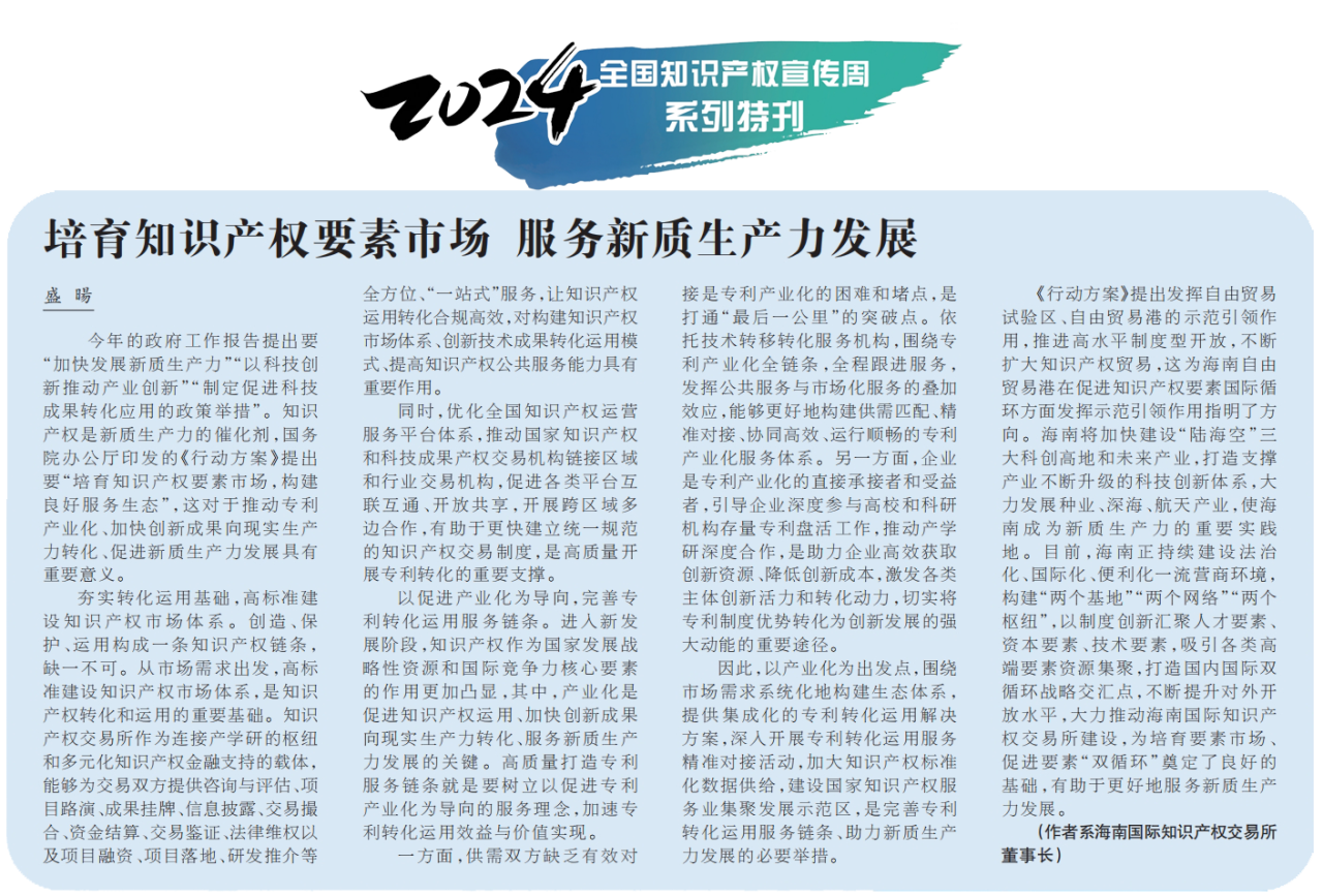 4月10日,海南國(guó)際知識(shí)產(chǎn)權(quán)交易所董事長(zhǎng)盛暘在中國(guó)知識(shí)產(chǎn)權(quán)報(bào)發(fā)表題為《培育知識(shí)產(chǎn)權(quán)要素市場(chǎng) 服務(wù)新質(zhì)生產(chǎn)力發(fā)展》的署名文章。全文如下:《中國(guó)知識(shí)產(chǎn)權(quán)報(bào) 》(4月10日 第6版)培育知識(shí)產(chǎn)權(quán)要素市場(chǎng)服務(wù)新質(zhì)生產(chǎn)力…