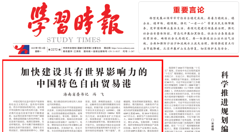 7月14日《學(xué)習(xí)時(shí)報(bào)》頭版刊發(fā)海南省委書(shū)記馮飛的署名文章《加快建設(shè)具有世界影響力的中國(guó)特色自由貿(mào)易港》版面圖及全文如下《學(xué)習(xí)時(shí)報(bào)》2025年7月14日 第1版中國(guó)式現(xiàn)代化是中國(guó)共產(chǎn)黨領(lǐng)導(dǎo)的社會(huì)主義現(xiàn)代化,是具有中…