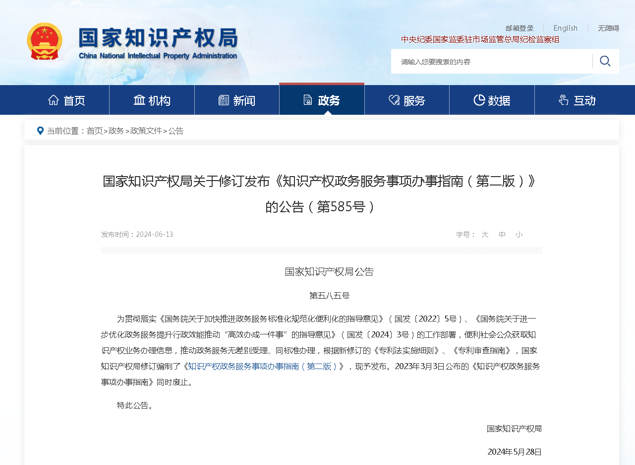 國家知識產權局公告第五八五號為貫徹落實《國務院關于加快推進政務服務標準化規(guī)范化便利化的指導意見》(國發(fā)〔2022〕5號)、《國務院關于進一步優(yōu)化政務服務提升行政效能推動“高效辦成一件事”的指導意見》(國發(fā)〔…