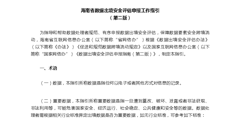 海南省數據出境安全評估申報工作指引(第二版)為指導和幫助數據處理者規(guī)范、有序申報數據出境安全評估,保障數據要素安全跨境流動,海南省互聯網信息辦公室(以下簡稱“省網信辦”)根據《數據出境安全評估辦法》(…