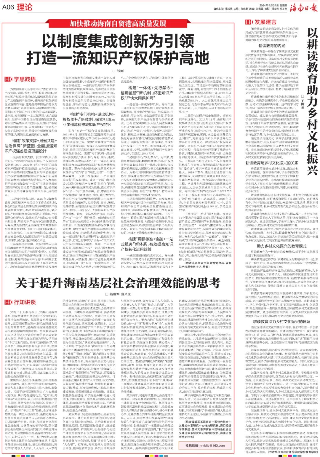 今天《海南日報(bào)》理論版頭條刊登海南省市場監(jiān)督管理局、省知識產(chǎn)權(quán)局黨組書記、局長鐵剛署名文章《以制度集成創(chuàng)新為引領(lǐng) 打造一流知識產(chǎn)權(quán)保護(hù)高地》,全文如下:為貫徹落實(shí)習(xí)近平總書記“要打通知識產(chǎn)權(quán)創(chuàng)造、運(yùn)用、…