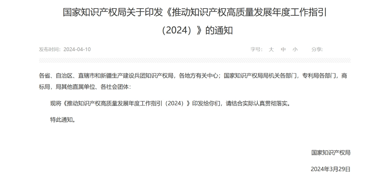 國(guó)家知識(shí)產(chǎn)權(quán)局關(guān)于印發(fā)《推動(dòng)知識(shí)產(chǎn)權(quán)高質(zhì)量發(fā)展年度工作指引(2024)》的通知各省、自治區(qū)、直轄市和新疆生產(chǎn)建設(shè)兵團(tuán)知識(shí)產(chǎn)權(quán)局,各地方有關(guān)中心;國(guó)家知識(shí)產(chǎn)權(quán)局局機(jī)關(guān)各部門,專利局各部門,商標(biāo)局,局其他直屬…