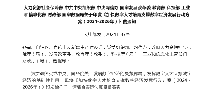 人力資源社會(huì)保障部 中共中央組織部 中央網(wǎng)信辦國(guó)家發(fā)展改革委 教育部 科技部 工業(yè)和信息化部財(cái)政部 國(guó)家數(shù)據(jù)局關(guān)于印發(fā)《加快數(shù)字人才培育支撐數(shù)字經(jīng)濟(jì)發(fā)展行動(dòng)方案(2024-2026年)》的通知人社部發(fā)〔2024〕37號(hào)各省…